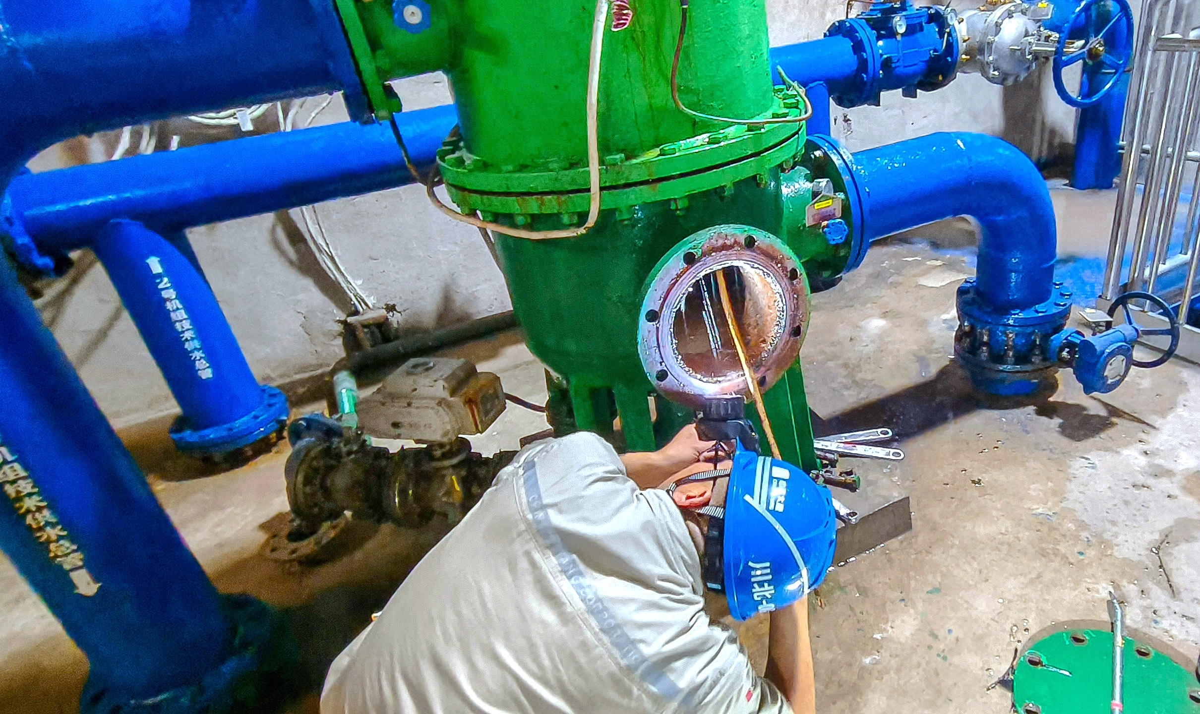 濾水器沉重的頂蓋被兩人合力打開(kāi)——眼前的景象令人心頭一沉:濾網(wǎng)已被厚厚的泥沙完全糊死,枯枝、塑料袋死死卡在網(wǎng)眼深處,密不透光。