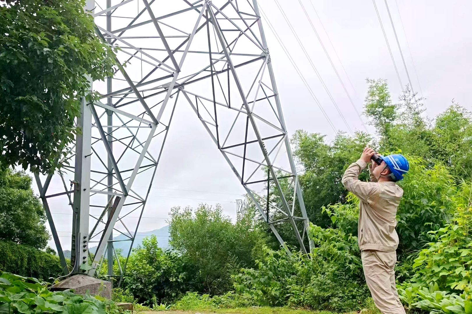 剛剛下過幾天小雨,山里的路還有些泥濘。每個人背著20多斤重的避雷器和備件,一步一個腳印走在山道上。晨露順著褲管往上爬,混雜著枯葉和泥水,打濕了每個人的褲腿。