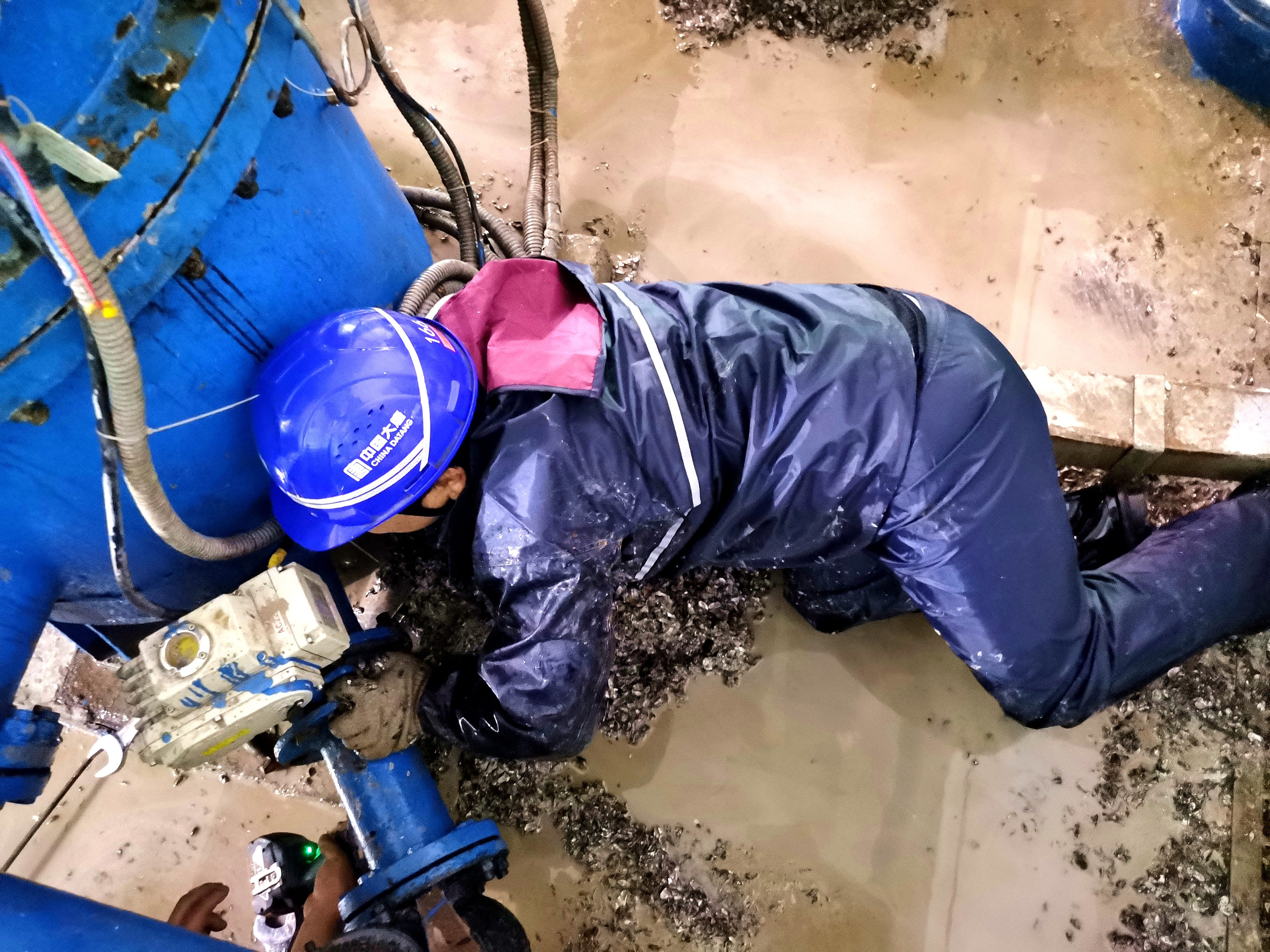 夏日里,廠房技術(shù)供水層潮濕、悶熱,溫度高達(dá)37攝氏度,比室外足足高出了4-5攝氏度。濾水器外圍空間狹小,突擊隊(duì)員或跪或爬,渾身浸透在濕淋淋的地面,徒手將附著在管壁內(nèi)的貝類雜物清理出來,刺鼻的腥臭味在潮熱的空氣中飄蕩開來。“這味道好呀,下班請(qǐng)大家吃海鮮?!睓z修工小李打趣道,引來大家一片歡笑。
