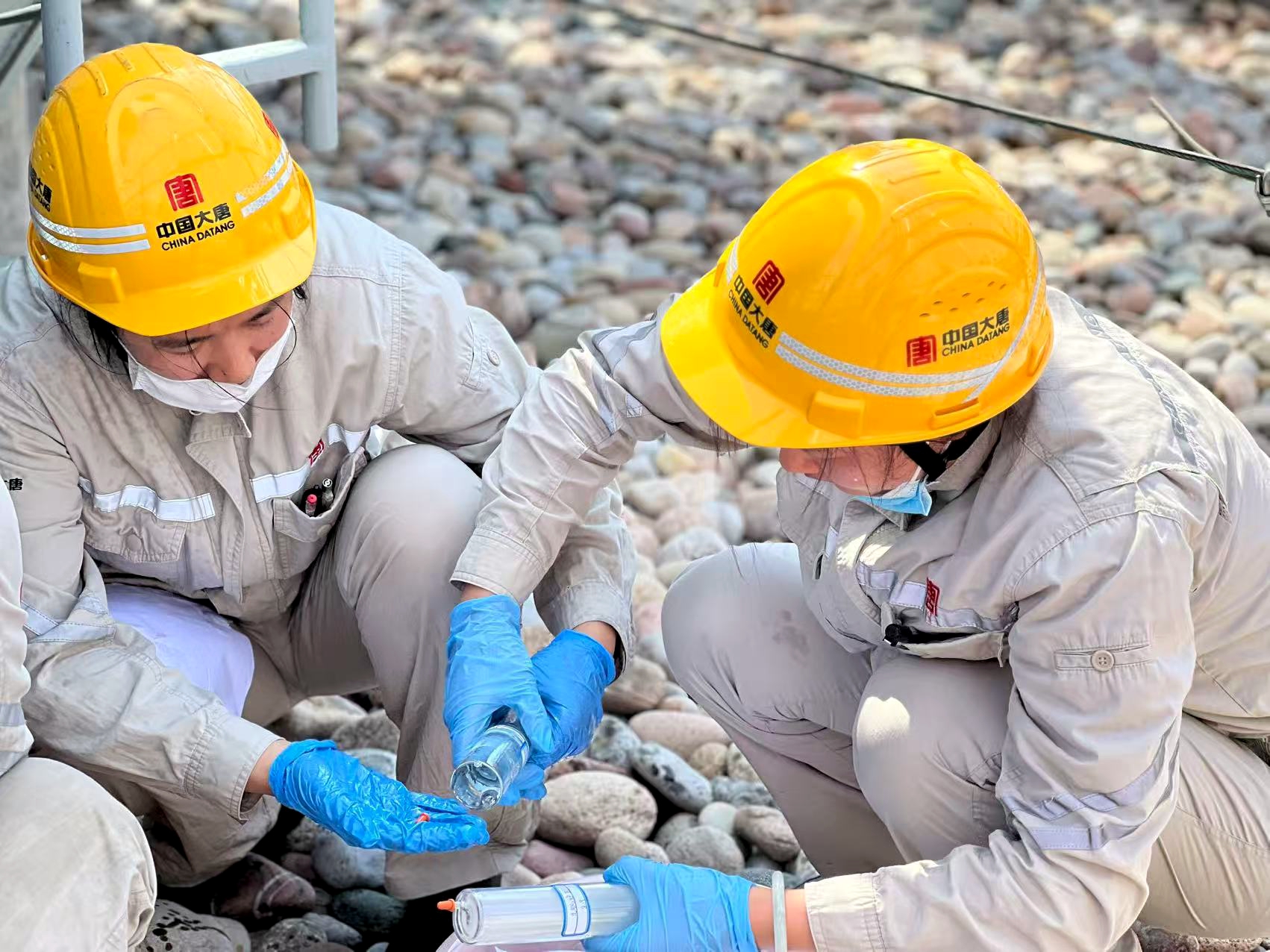4位身著工裝的“娘子軍”手提取樣瓶,穿梭在設(shè)備之間——有人手里攥著棉布,隨時準(zhǔn)備擦拭取樣瓶;有人護(hù)著裝滿油樣的取樣瓶,生怕被陽光直射影響樣品質(zhì)量。盡管臉龐被曬得通紅,汗水在安全帽帶下匯成細(xì)流往下淌,但遞工具、接樣品、擦瓶身、封瓶口的動作,始終有條不紊、一絲不亂。