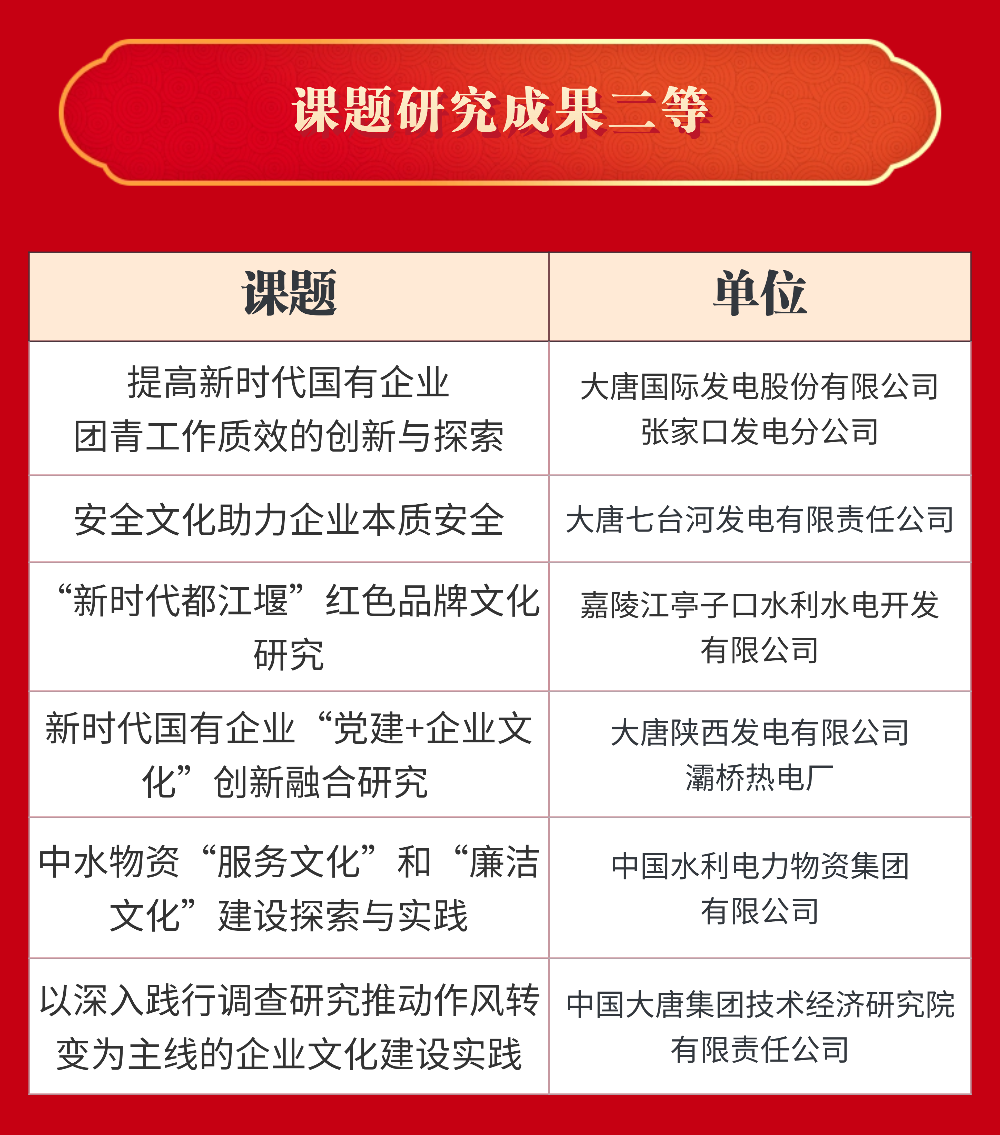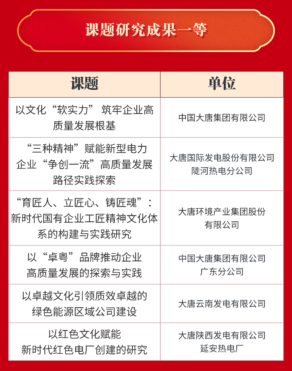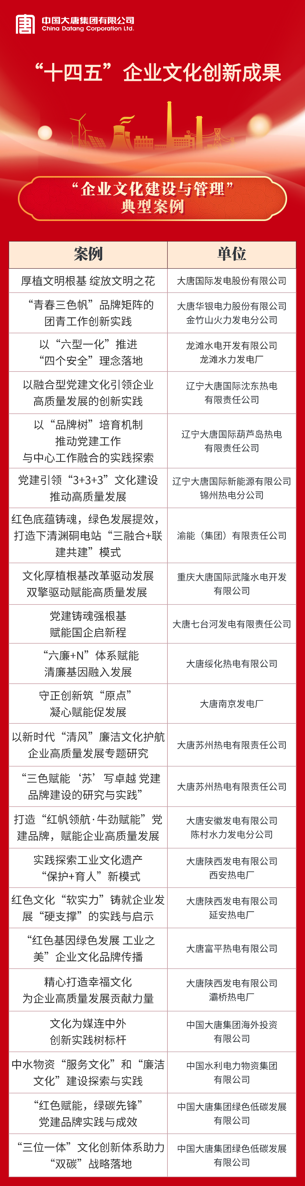 大唐國際發(fā)電股份有限公司等22家單位獲評“十四五”企業(yè)文化建設(shè)與管理典型案例;中國大唐及所屬8家單位獲評“十四五”企業(yè)文化建設(shè)與管理典型經(jīng)驗(yàn);中國大唐及所屬5家單位獲評課題研究成果一等;大唐國際發(fā)電股份有限公司張家口發(fā)電分公司等6家單位獲評課題研究成果二等。具體名單如下: