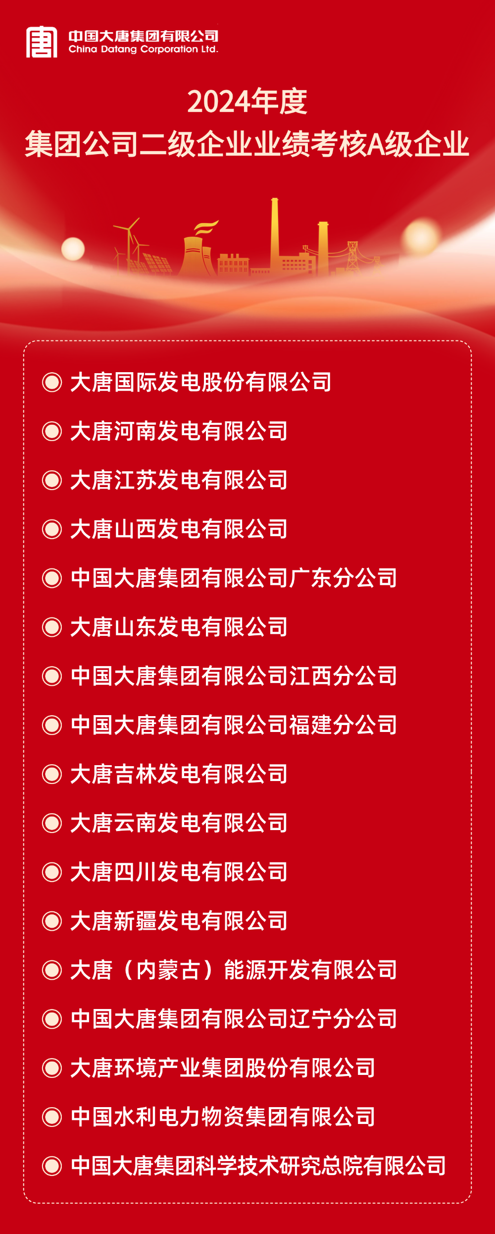 本網(wǎng)訊 根據(jù)《中國(guó)大唐集團(tuán)有限公司所屬企業(yè)年度業(yè)績(jī)考核辦法》和《中國(guó)大唐集團(tuán)有限公司所屬企業(yè)任期業(yè)績(jī)考核管理辦法(試行)》及有關(guān)規(guī)定,2024年度及2022-2024年任期二級(jí)企業(yè)業(yè)績(jī)考核結(jié)果已經(jīng)集團(tuán)公司董事長(zhǎng)專題會(huì)審議通過(guò)。A級(jí)企業(yè)名單如下: