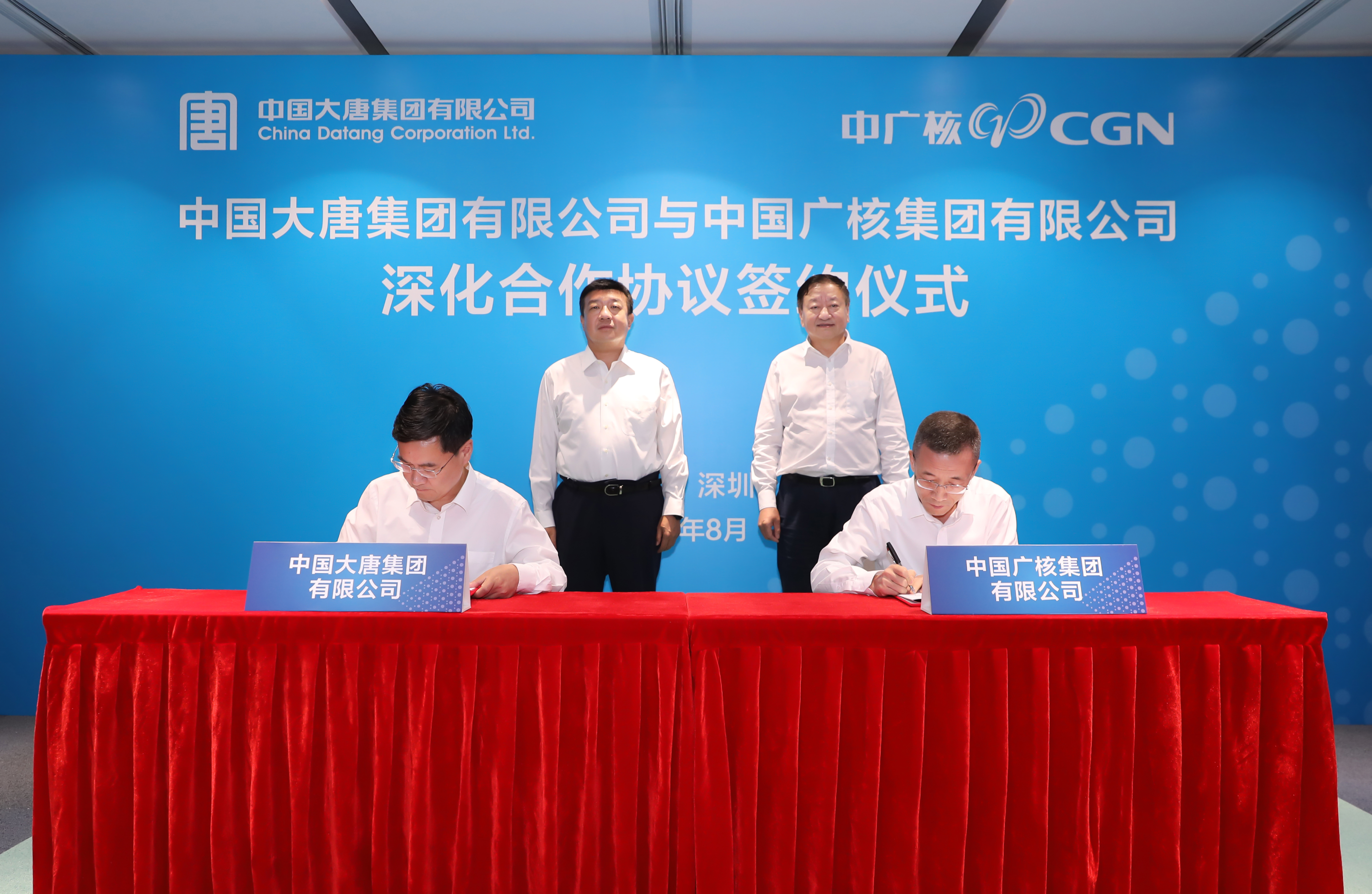 本網(wǎng)訊 8月6日,中國(guó)大唐集團(tuán)有限公司與中國(guó)廣核集團(tuán)有限公司在深圳簽署深化合作協(xié)議。簽約前,中國(guó)大唐黨組書記、董事長(zhǎng)呂軍與中廣核黨委書記、董事長(zhǎng)楊長(zhǎng)利圍繞核能、新能源、國(guó)際業(yè)務(wù)合作等進(jìn)行深入座談交流。