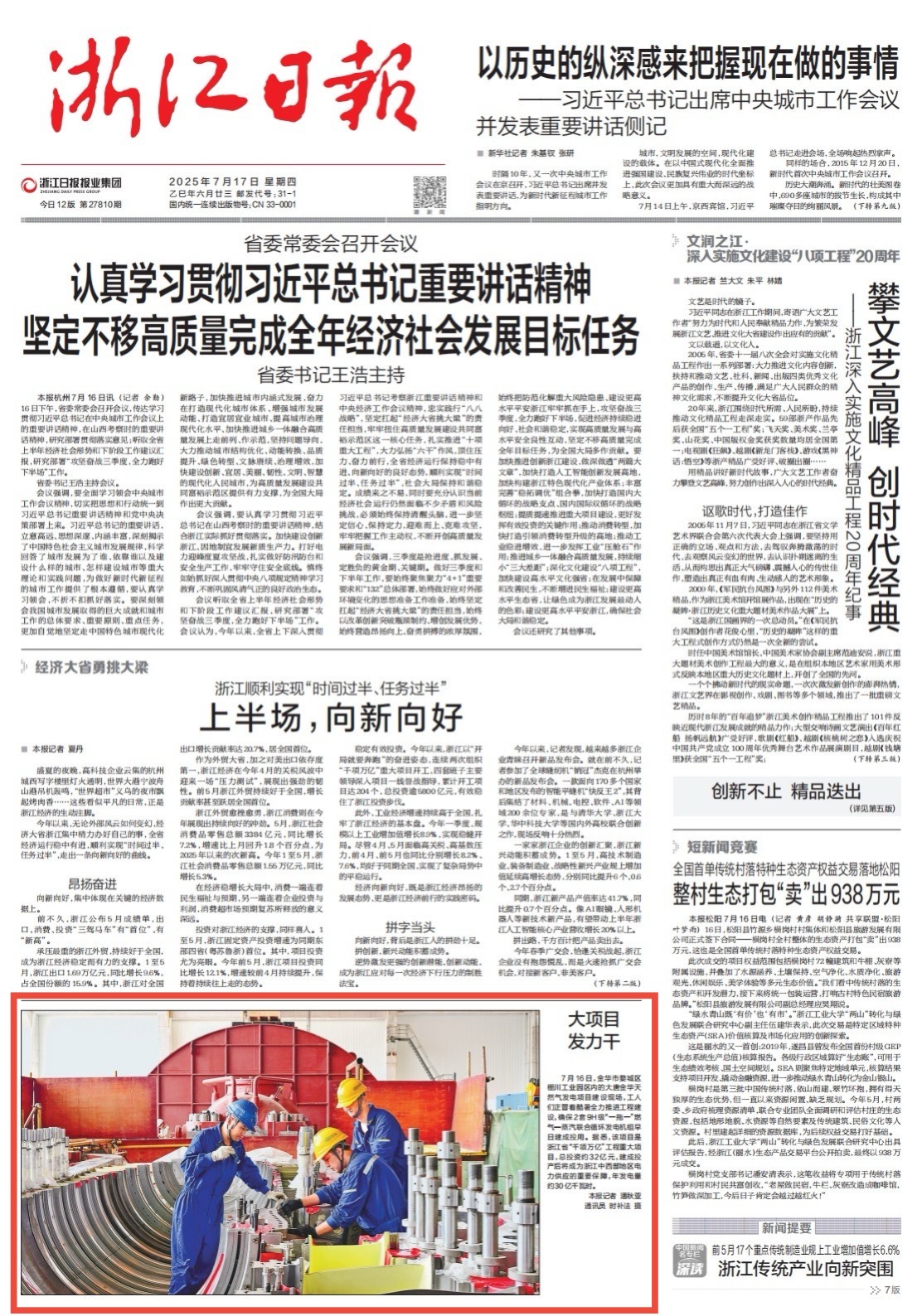 [浙江日?qǐng)?bào)]2025-7-17-頭版:大項(xiàng)目 發(fā)力干—大唐(金華)清潔能源有限公司