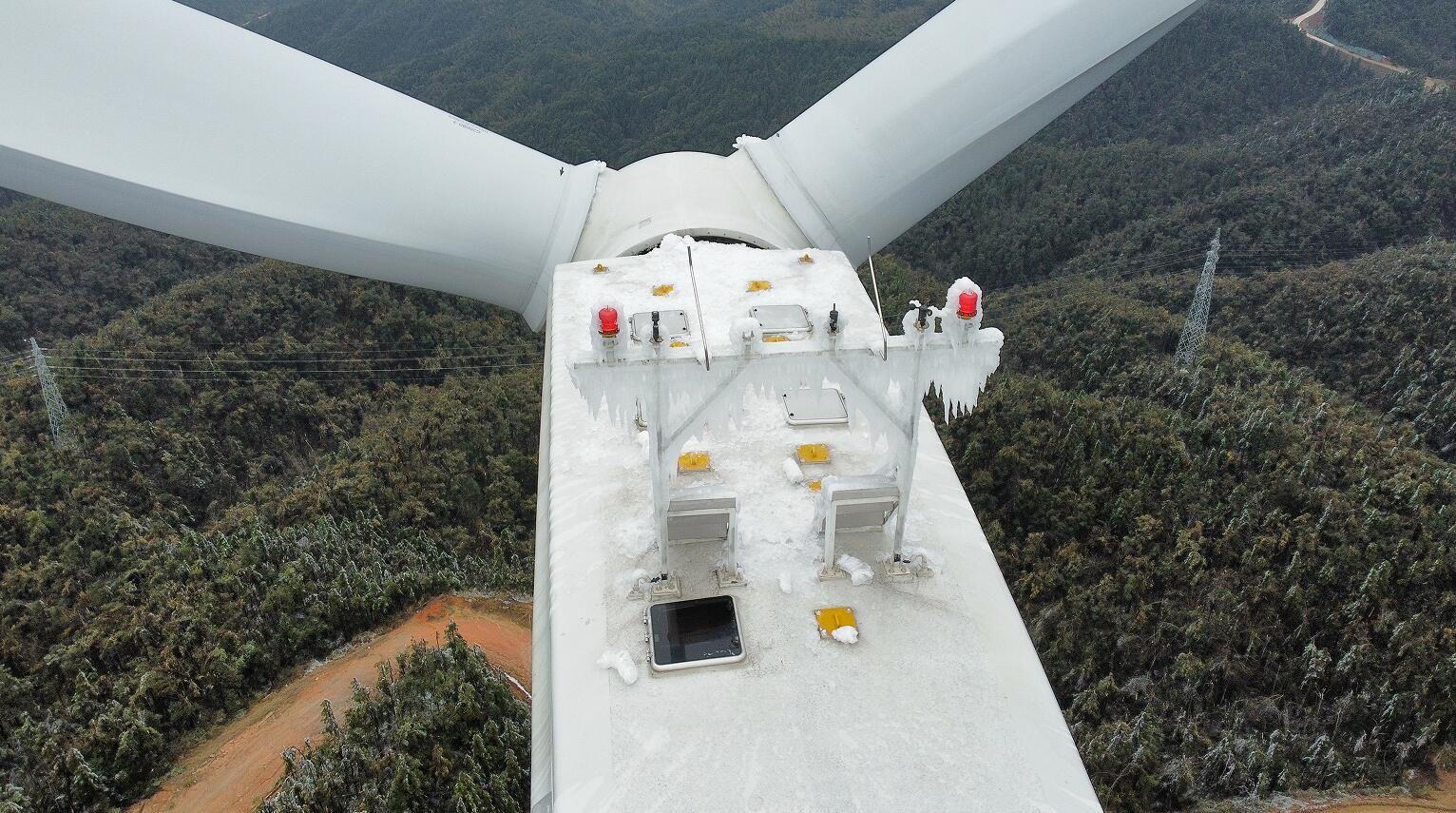 在此次覆冰前后的過(guò)程中,江西新能源公司運(yùn)維人員緊盯設(shè)備情況,覆冰時(shí)及時(shí)手動(dòng)停機(jī),對(duì)解除覆冰的風(fēng)機(jī)開(kāi)展現(xiàn)場(chǎng)查看,確認(rèn)后進(jìn)行啟機(jī),13個(gè)場(chǎng)站成功處理并解決7次因冰雪造成的集電線(xiàn)路和外送線(xiàn)路跳閘事件和多臺(tái)箱變外殼被葉片融冰砸損情況。