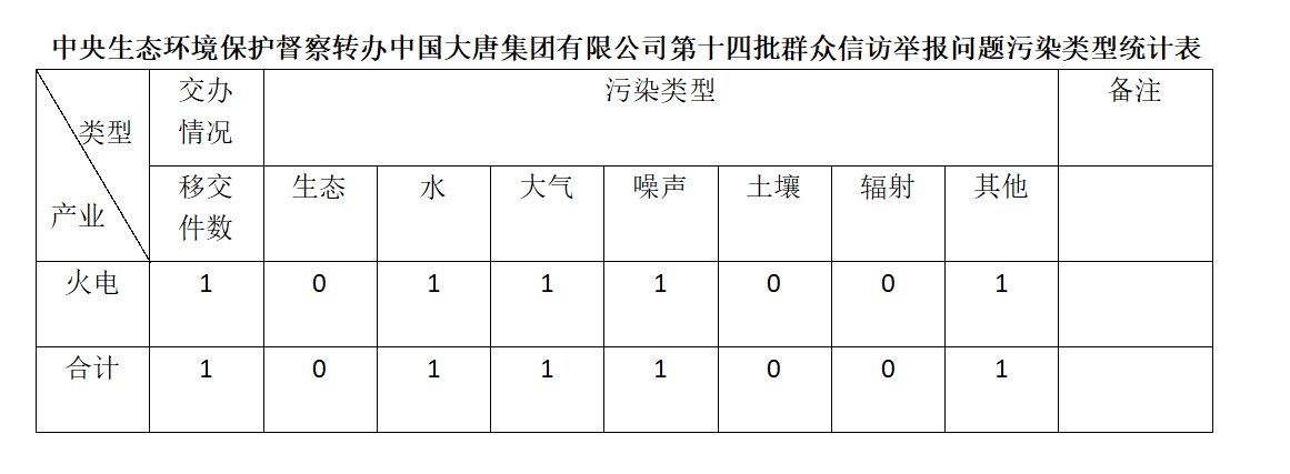 2025年6月20日,中央第七生態(tài)環(huán)境保護(hù)督察組向中國大唐集團(tuán)有限公司移交第十四批群眾信訪舉報件,共計(jì)1件,為來電舉報,涉及水問題1個、大氣問題1個、噪聲問題1個、其他問題1個。所有舉報件辦理工作已第一時間進(jìn)入調(diào)查核實(shí)辦理程序,辦理情況將按照相關(guān)要求反饋督察組,并及時向社會公開。